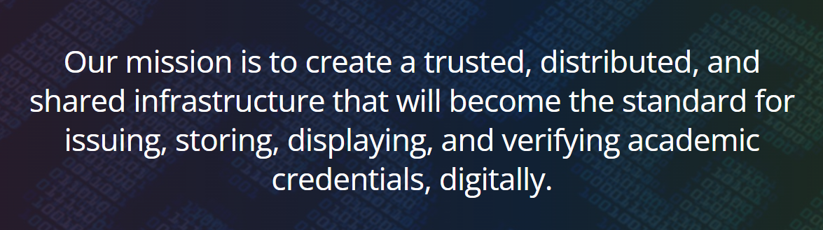 우리의 미션은 신뢰할 수 있고 분배할 수 있고, 공유할 수 있는 인프라를 만드는 것이다. 이것이 표준화되어 디지털 기반으로 학업 역량을 검증하고 표현하고 보관하고 발급할 수 있도록 하고자 한다.